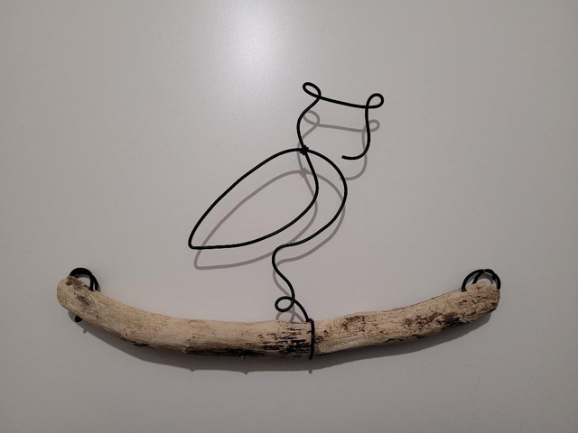 Hibou en fil aluminium sur bois flotté